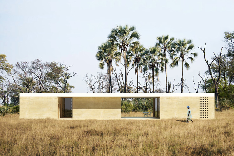 Living and sleeping zones of the house are divided by big shaded terrace - the heart of building, especially during the evenings and colder months. The whole structure is covered by flat concrete roof – its white colour reflects sun's rays and minimizes the need for cooling. All the walls are made of rammed earth - taking inspiration from traditional African huts, often build from mud or earth. This material is easily accessible, sustainable and protects the building from overheating. Use of local sand naturally blends the house with the surrounding landscape.