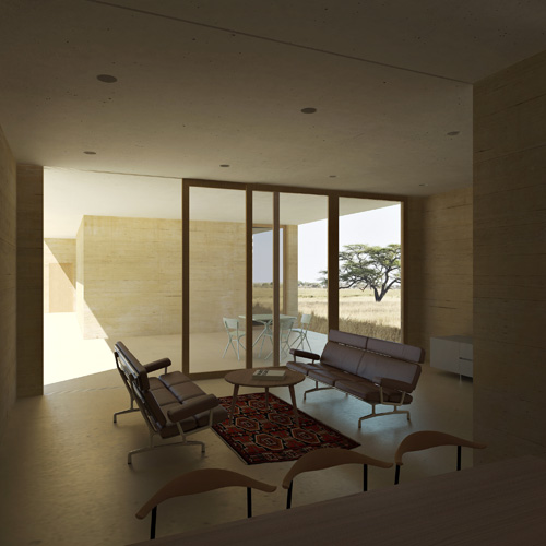 Project's aspiration is to create simple, sustainable house, blended with the surroundings and rooted in the local building traditions. In hot Angolan climate providing protection from the sun is crucial for inhabitants comfort. To minimize sun penetration and allow views all windows are shadowed by deep overhangs. Narrow plan and fenestration of two opposite sides of each room allows natural ventilation, thus greatly reducing the use of active cooling systems.
