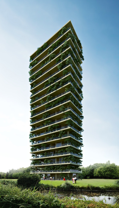 Principles of using sun radiation in passive way are gaining importance in single-family houses design (passive house – energy standard invented in Germany in the 90ties and getting more and more popular, especially in Germany and Scandinavia). This project can be seen as a stack of single family houses creating residential tower. Each apartment covers whole floor and has two parts differing in energy performance – insulated core and winter garden, being a transition zone between the interior and the exterior of the building. The percentage of glazing of core differs depending on the orientation – south, east and west façades (for buildings located on northern hemisphere) have big floor-to-ceiling windows, while north façade has very small openings, only to enable cross-ventilation. Communication core is located in the north part of the building and creating a thermal buffer for apartments. Building is long and narrow to maximize length of south façade and thus heat gains. Core is surrounded on 3 sides (except north façade) by winter garden with fully glazed openable façade. In the winter the space is thermal buffer and in the summer (when the façade is open) it becomes spacious shaded terrace. The winter garden’s slab is creating overhang for the apartment below – it blocks the direct sun radiation in the summer and allow sun to penetrate the rooms in the winter. The trees are providing additional shading in the summer, they also protect from wind, noise, capture dust particles, CO2 and produce oxygen.