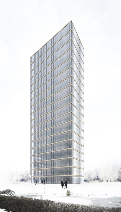 Building uses mass timber (columns and slabs laminated from smaller pieces of wood) for main structural elements and supplementary reinforced concrete foundations and beams (allowing longer spans between columns and thus more flexibility in floor layouts). Wood is renewable material and has a capacity to absorb CO2 from atmosphere. According to SOM’s research project for mass timer structural system for 42-storey skyscraper, this solution can reduce building’s carbon footprint by 60 to 75%, compared to concrete equivalent.