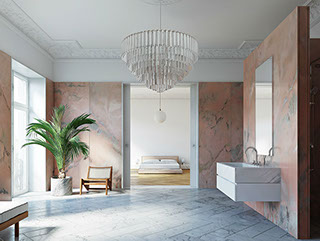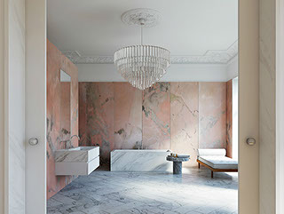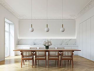 The initial stage of the project involves restoration of the original elements: floorboards, cornices and window frames. White walls and warm hue of the wooden floors create simple ‘canvas’ for the design. Interior is filled with elements from white Carrara (countertops, tables, washbasin, bathtub) and pink marble (cladding of bathroom walls). Furniture mainly consists of modern classics designed by leading XX century designers, including: Le Corbusier, Jean Prouvé, Sergio Rodrigues or Piero Lissoni. Furniture’s materials (natural wood, white and warm hues) harmonize with the interior’s colour palette.