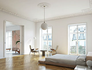The interior design of the spacious apartment in Paris aims at merging classical beauty of the XIX century building with very simple and modern solutions.