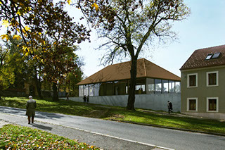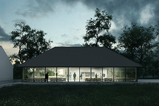 Proposed building tries to fit into those picturesque surroundings - like all neighbours it has pitched roof with eaves, covered with red ceramic tiles. Roofing is the most visually present part of the building, which allows to blend it with surroundings by this simple mimicking gesture. "Historic" roof is contrasted with fully transparent facade of entrance level. The lower floor, from the street visible as solid concrete wall, is partly sunken in the ground, reducing visual impact of the building. Like most neighbours (except the church and the manor) community centre has a compact footprint.