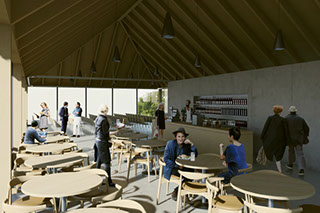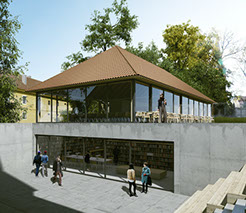 The main entrance to the building is situated on the upper floor - glass curtain walls reveal what is happening inside to invite visitors and engage them in the community life. Floor plan of this level is very flexible - it contains cafe and multipurpose hall - both spaces can serve many different functions. 50-seats cafe works as foyer, info centre, reception and pram parking. If needed, it can be transformed into exhibition space or any other function needed by the community. Cafe's terrace opens up to Hloubětín Chateau gardens and allows additional seasonal outdoor seating. Multipurpose hall with 100 seats can be used for: informal meetings of residents, social events (weddings, celebrations, balls), discussions, exhibitions and courses. Both spaces are divided only by curtains, which allows to easily transform the whole floor into one open space. The bottom level of the building contains local branch of public library (12.000 volumes), restrooms and technical spaces. Library opens up to the patio connected to the garden by wooden stairs - they can serve as the outside seating in warmer months.