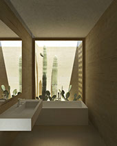 Project's aspiration is to create simple, sustainable house, blended with the surroundings and rooted in the local building traditions. In hot Angolan climate providing protection from the sun is crucial for inhabitants comfort. To minimize sun penetration and allow views all windows are shadowed by deep overhangs. Narrow plan and fenestration of two opposite sides of each room allows natural ventilation, thus greatly reducing the use of active cooling systems.