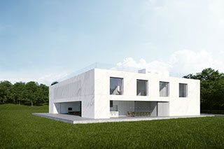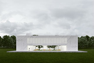Externally the mansion has an appearance of a simple, white, stone block, perforated by big openings. House has a solid, robust presence emphasizing ambition to create lasting, durable piece of architecture. This aspiration is also visible in the choice of materials - all facades are clad with big panels of white marble. More private parts of the building (i.e. swimming pool) are covered only with thin panels of this material - its translucency enables sun penetration while securing privacy.